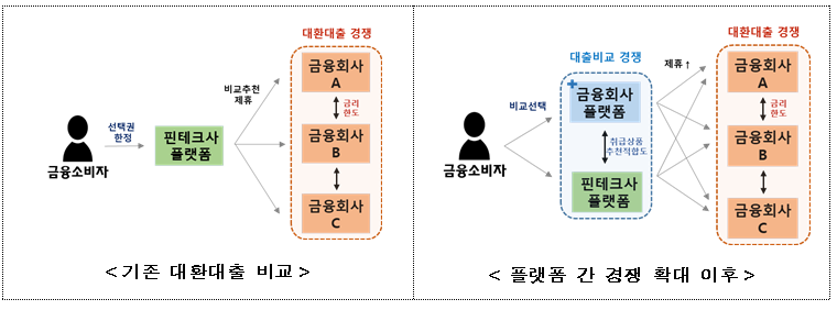 참여 금융 회사는 은행권(19개 은행 전체), 비은행권 (저축은행 18개, 카드사 7개, 캐피털 9개 등) 무려 53개 회사입니다. 우리가 접할 수 있는 대부분의 대출제공 회사라고 봐도 무방합니다. 이뿐만 아니라 23개의 대출비교 플랫폼 들도 참여할 예정이어서 고객을 유치하기 위한 무한 경쟁에 돌입하여, 소비자 입장에서는 대환대출이 지금보다 훨씬 쉬워질 것으로 예상됩니다.