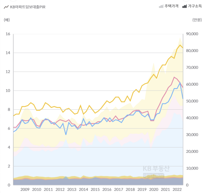 미국과 한국의 실정은 다르지만, 서울 시내 아파트 중윗값은 9억이 넘습니다. 연봉 1억이라고 해도 3억짜리 집은 서울 근처는커녕 경기도를 눈 씻고 찾아봐도 얼마 없습니다. 한국의 실정에 맞게 연봉의 N배라고 말씀드리는 전문가는 없더라고요. 왜냐하면 한국의 부동산 시장은 이미 저축+자산의 시장으로 바뀐 지 오래 기 때문입니다. 레버리지인 전세제도도 있고요. 서울의 PIR(Price Incom Ratio) 지수는 2023년 초 기준 20입니다. 중윗값 연봉자가 중윗값 주택을 사려면 한 푼 쓰지 않고 20년을 모아야 구매가 가능한 지수입니다. 2009~2013년 PIR이 6~8이었다가 오버슈팅되어 지금은 20이라니 미국과 확실히 다른 시장임은 확실합니다.